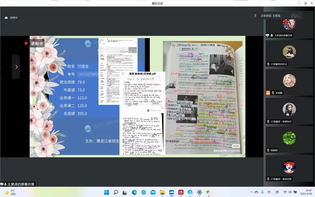 为进一步提高英语专业学生学习热情,明确学习方向,寻找合适的学习方法,营造积极向上的学风,同时加强学生对考研知识和经验的了解,明确考研目标,掌握考研相关技巧,了解更多考研信息,4月28日晚19:00,西语学院通过腾讯会议平台举办了考研学习经验交流会。本次交流会邀请了我院2018级翻译1班石宇琦、2018级英语教育7班王祎凝、2018级英语教育8班王昊泽三名同学为大家做了经验分享,西语学院副处级辅导员杨晓明和2019、2020、2021级英语、翻译和商务英语专业的同学们参加了此次交流会。本次交流会由学院学生就业与创业服务中心主任朱明静同学主持。